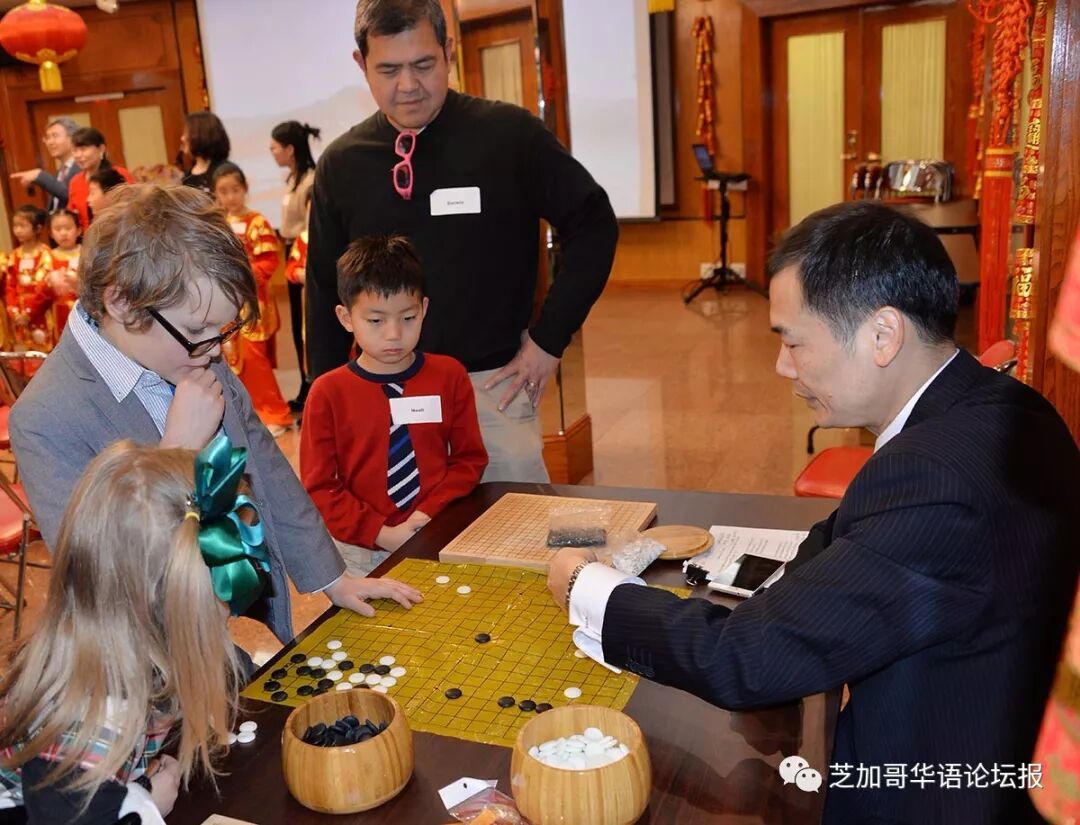上图:赵建总领事在教小朋友下围棋。(张大卫摄)