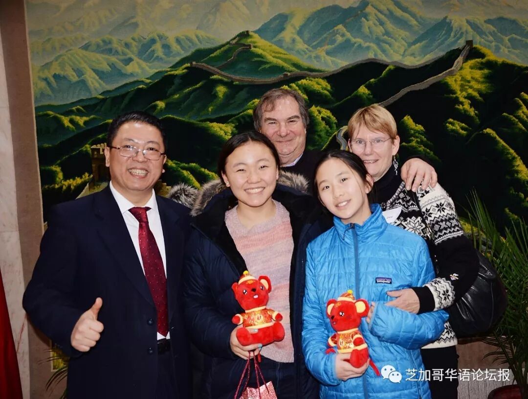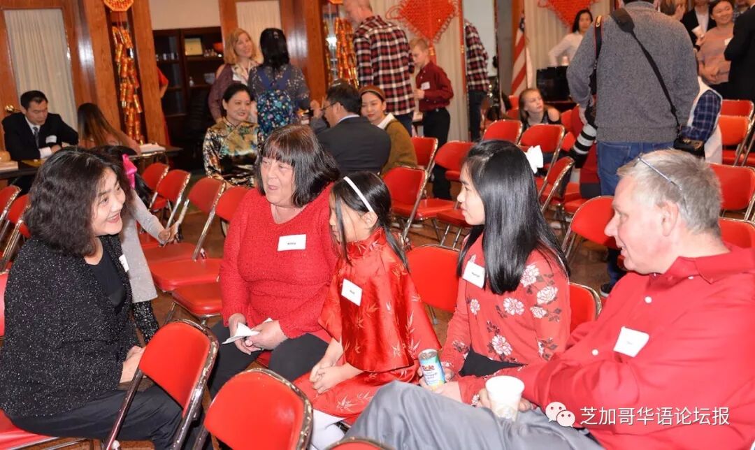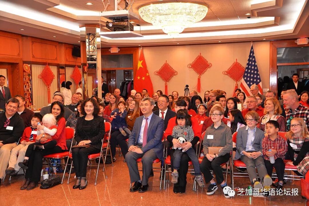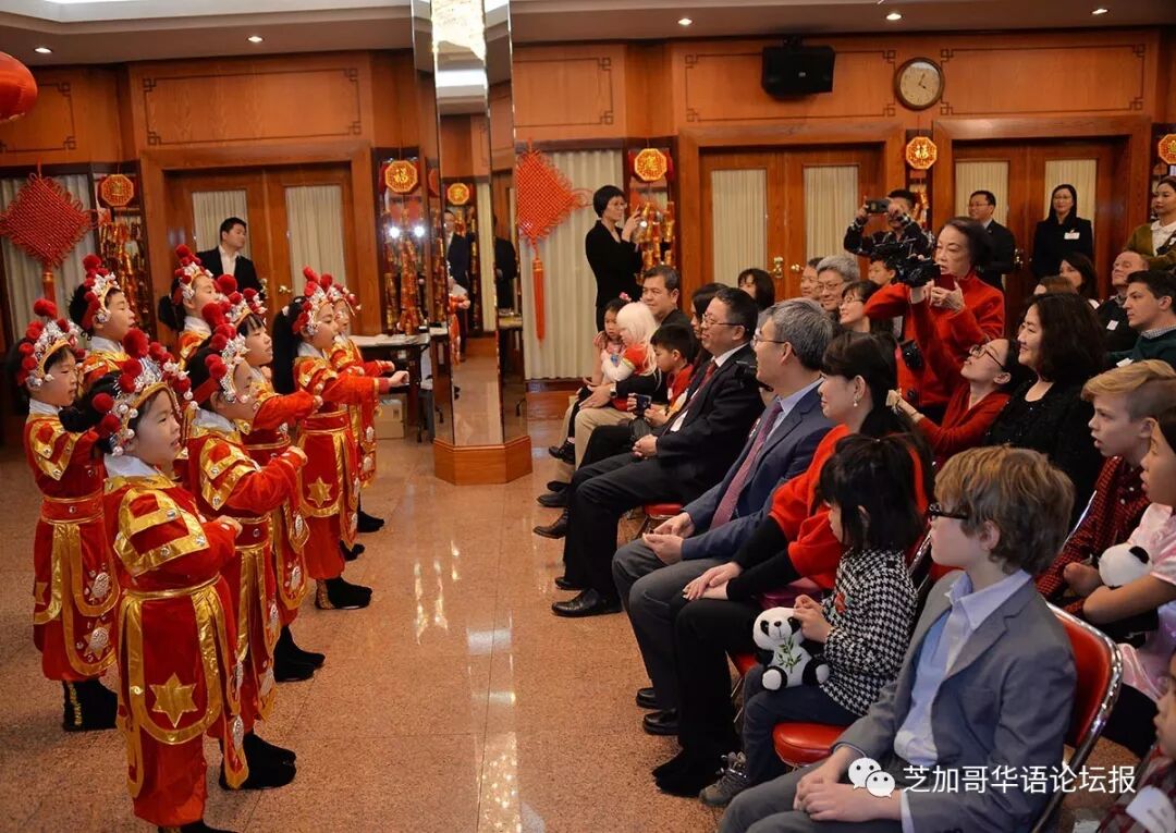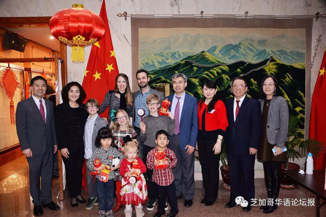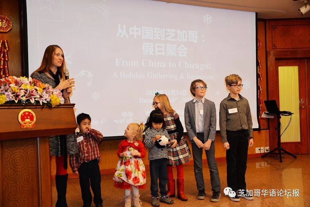 (《芝加哥华语论坛》报记者张大卫报道)当地时间12月14日下午,在中国驻芝加哥总领馆大厅,灯火辉煌,笑语声喧,一片喜气洋洋的节日景象。十几个美国中西部领养中国儿童的美国家庭欢聚在一起,热热闹闹地迎接即将到来的圣诞节和中国春节。从中国领养来的孩子们和他们的父母亲和兄弟姊妹们,第一次来到中国驻芝加哥总领馆高兴地参加充满亲情和东西方文化交融氛围的节庆聚会。