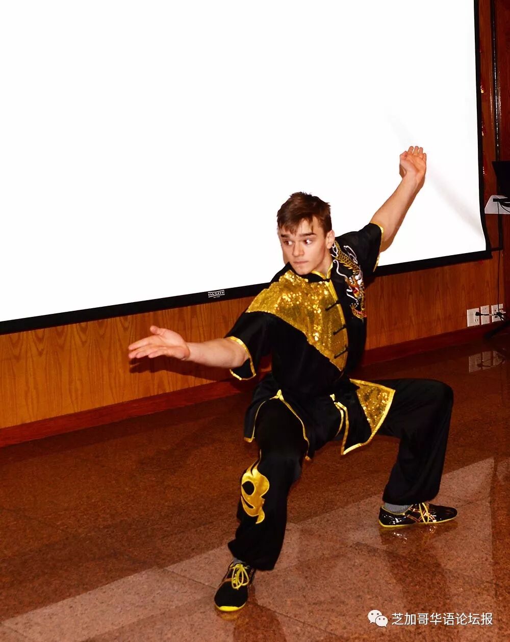 上图: 北斗功夫学院的安托尼表演中国武术。(张大卫摄)