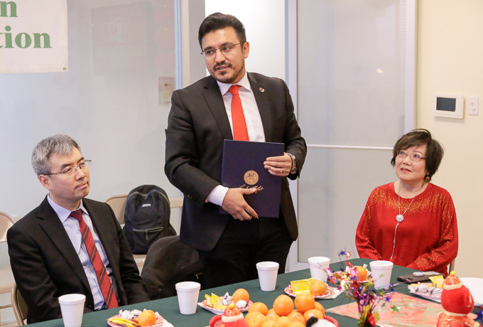 1月10日,芝加哥第25区区长卢汉士(Byron Sigcho-Lopez)在驻芝加哥赵建总领事向美中亚裔健康协会(MAHA)拜年期间,将市长亲手签署的中国新年日官方公告赠与赵建总领事,并传达了市长莱富特的问候。