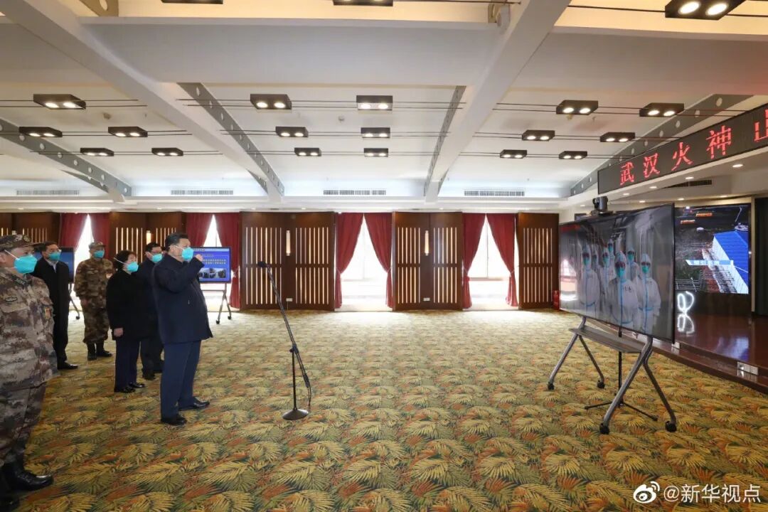 在火神山医院指挥中心,习近平听取医院建设运行、患者收治、医务人员防护保障、科研攻关等情况介绍。习近平指出,疫情发生以来,包括军队在内的广大医务工作者发扬特别能吃苦、特别能战斗的精神,义无反顾奔赴湖北和武汉,毫无畏惧投入防控救治工作,日夜奋战,舍生忘死,不负重托,不辱使命,同时间赛跑,与病魔较量,为武汉疫情防控工作作出了重要贡献。军队医务人员牢记我军宗旨,召之即来,来之能战,战之能胜,为党旗、军旗增添了光彩。沧海横流,方显英雄本色。你们真正做到了救死扶伤、大爱无疆。你们是光明的使者、希望的使者,是最美的天使,是真正的英雄!党和人民感谢你们!