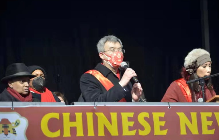 赵建总领事在仪式上发表致辞,向当地广大华侨华人和各界朋友们致以诚挚的新春祝福。他表示,春节是中华民族最重要的传统节日,芝加哥中国城春节庆祝活动体现了当地华人社区对中国传统文化的传承,集中展现了中华民族昂扬奋进、团结友善、守望相助的精神与品格。长期以来,芝加哥市以及美国中西部地区华人与其他各族裔和睦相处,勤奋工作,以自己的努力为地区繁荣发展进步作出重要贡献,他们的成就令人骄傲。赵建总领事表示,普利兹克州长和莱特富特市长以及当地众多政要参加芝加哥中国城春节庆祝活动,体现了对华人社区和多元文化的支持以及对团结互助和谐精神的承诺。面对新冠疫情以及各种挑战,没有哪个社区、哪个民族或是哪个国家能够独善其身或独自应对。只有团结合作、守望相助,才能战胜困难。中国驻芝加哥总领馆愿继续与伊利诺伊州政府和芝加哥市政府及各界一道,努力推动中美地方合作和人文交流,促进共同发展繁荣。赵简要介绍中国人民为举办一届简约、安全、精彩的冬奥盛会所作努力,指出,正如奥林匹克运动传递的和平、团结、进步精神一样,人类是一个命运共同体,让我们携起手来,一起向未来!