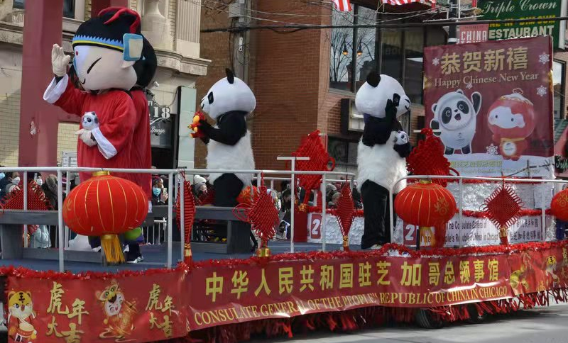 花车游行活动中,共有大芝加哥地区侨学各界、各团体、中国城中小学校及各族裔代表组织的10辆花车、15支游行队伍、7个舞龙舞狮方队、4支鼓乐队同芝加哥市民一道庆祝虎年新春。总领馆花车以北京冬奥会吉祥物冰墩墩、雪容融为主背景,花车上中国风的京剧娃娃、憨态可掬的熊猫与观众频频互动,深受喜爱。
