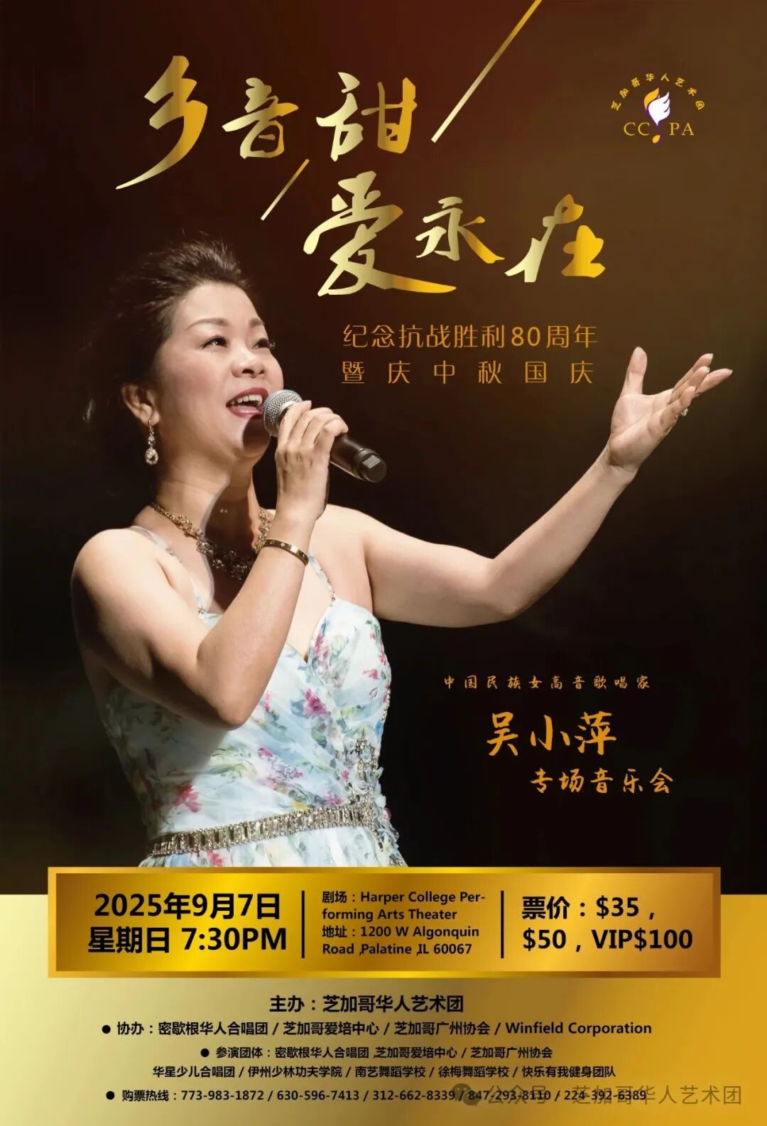 美国华网王敏华胡大江摄影报道:芝加哥华人艺术团9月7日晚在Harper College Performing Arts Center Theater隆重推出《乡音甜爱永在》——纪念抗战胜利80周年暨庆中秋国庆中国民族女高音歌唱家吴小萍专场音乐会。国际著名女高音歌唱家、中美音乐文化交流使者——张莉教授将作为献唱嘉宾重磅加盟,与吴小萍共同演绎令人难忘的音乐华章。